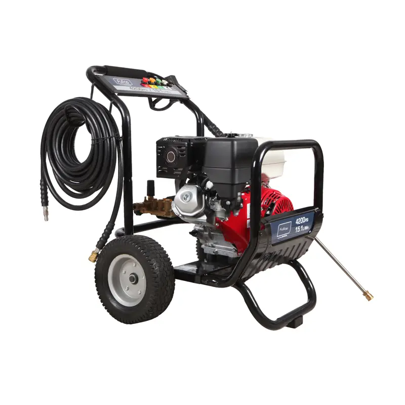 FPW-4200H is a heavy-duty model delivering 4200 PSI (290 bar) pressure with a high 4.0 GPM (15.1 L/min) flow rate, powered by an FP459 (GX390 class) gasoline engine. Equipped with a triplex pump, 15 m professional hose, and 13×4 inch wheels, it ensures stable performance and long service life, making it ideal for industrial facilities, fleet maintenance, and continuous high-load cleaning operations.